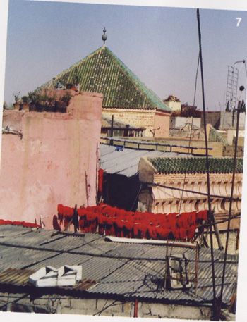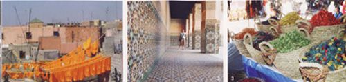 1. Toprak rengi yapıları kumaşçılar çarşısında kuruyan canlı iplikler renklendiriyor. 2. Ben Youssef Medresesi rengarenk zilij'leriyle Fas'ın sıcak havasını yansıtıyor. 3. Baharatçılar çarşısında renkli kuru çiçekler.